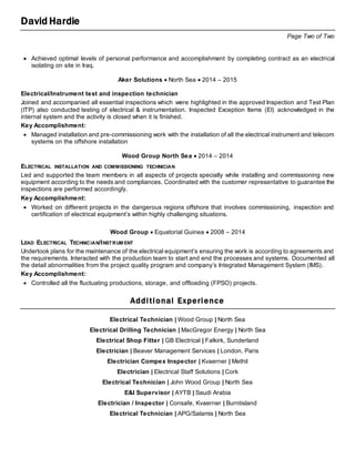 David Hardie has over 15 years of experience in electrical installation, testing, commissioning, and maintenance across various industries. He has worked on offshore oil and gas installations, wind farm projects, and mining facilities. His roles have included electrical technician, QA/QC inspector, commissioning technician, and electrical isolating authority. He is proficient in all aspects of electrical systems from installation to startup and loop testing to preventative maintenance.