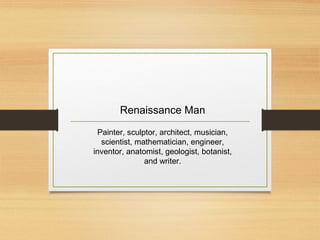 Leonardo da Vinci (1452-1519) was an Italian polymath, regarded as one of the greatest painters and inventors of all time. As a painter, his most famous works include the Mona Lisa and The Last Supper. However, he was also a scientist, mathematician, engineer, inventor, anatomist, and wrote thousands of pages of notes on a wide range of subjects. Though only around 15 of his paintings survive today due to experimental techniques, his notebooks provide insight into his vast intellect and many inventions that were far ahead of their time, such as designs for helicopters, tanks, and bridges. He was without a doubt one of the most diversely talented individuals of the Renaissance era.