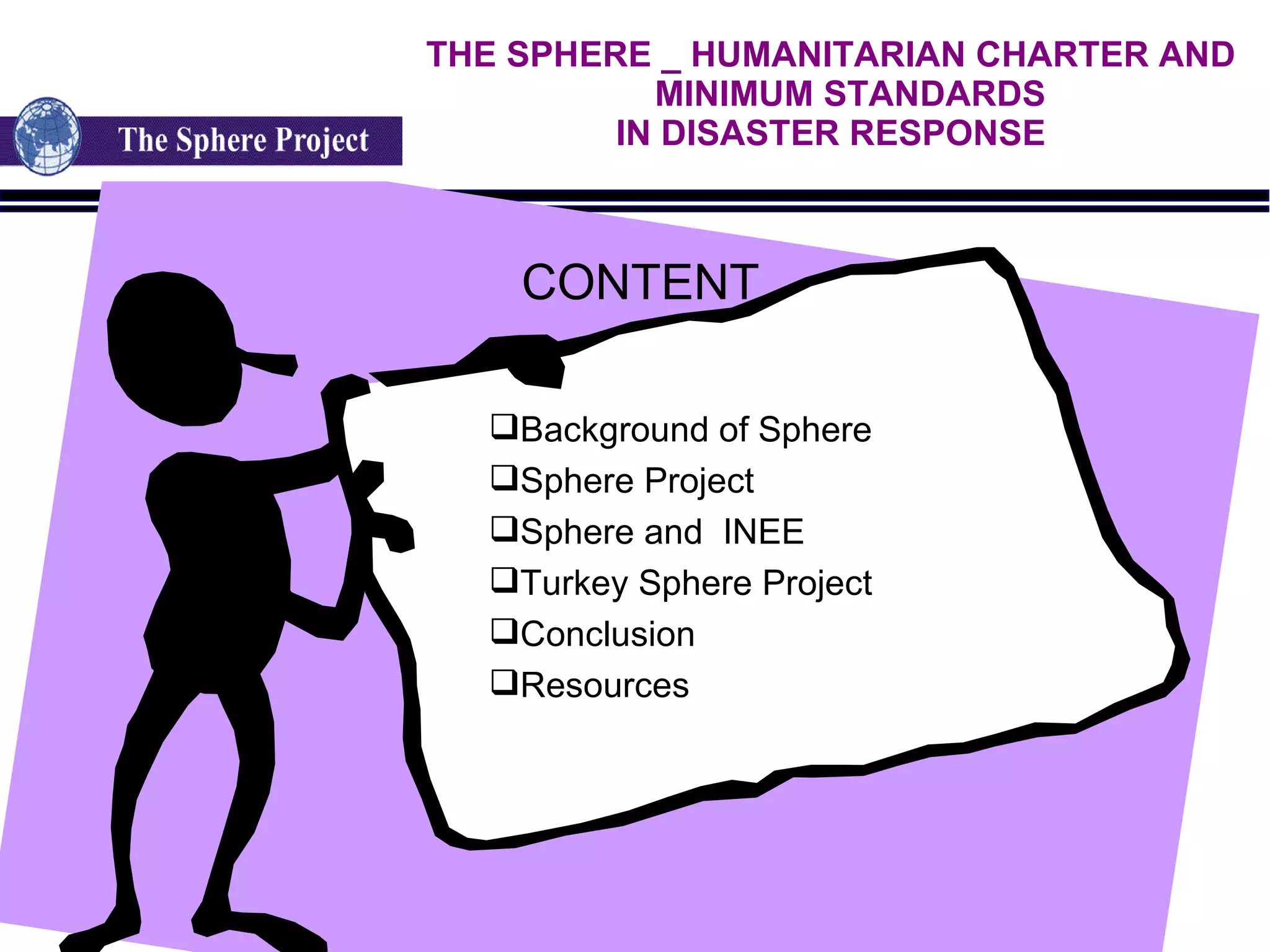 The document discusses the Sphere Project, which establishes minimum standards for humanitarian response. It provides background on Sphere, including that it launched in 1997 and published updated handbooks in 2000 and 2004. It summarizes the key components and chapters of the Sphere handbook, including standards for water/sanitation, food/nutrition, shelter, and health. It then discusses Turkey's Sphere Project from 2008-2009 that aimed to disseminate and adapt Sphere standards locally through trainings.