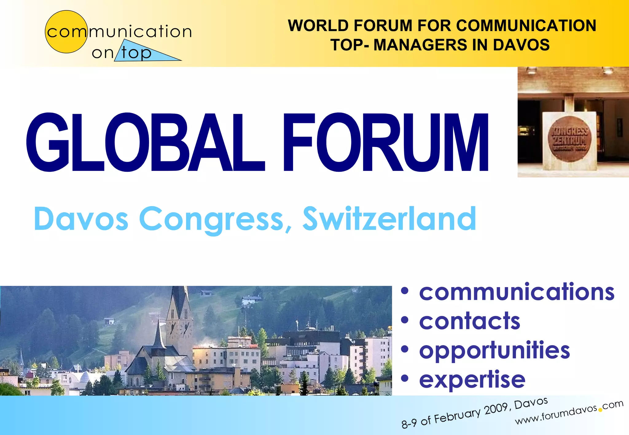 The World Forum for Communication, held in Davos on February 8-10, 2010, aims to bring together top managers and communication experts to explore best practices and innovative approaches in global communications. The event will feature plenary sessions, workshops, and master classes, promoting networking and collaboration among participants. Attendees will have opportunities to share ideas through a virtual platform and an exhibition, fostering dialogue on overcoming global challenges in communication.