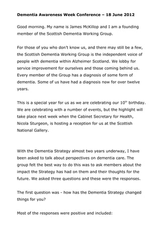 James McKillop from the Scottish Dementia Working Group discussed the impact of the dementia strategy during the conference, highlighting positive changes such as increased awareness, quicker diagnoses, and improved services. Members noted the need for better training for GPs, more consistent services, and ensuring the voices of people with dementia are heard in future strategies. The group remains optimistic about ongoing improvements and looks forward to new initiatives, including a report on mid-stage support from Alzheimer Scotland.
