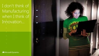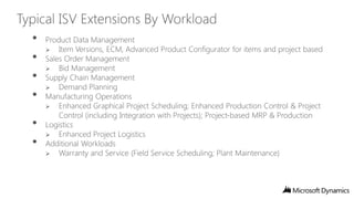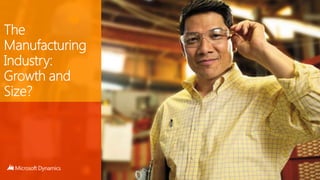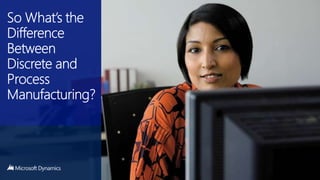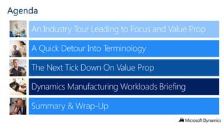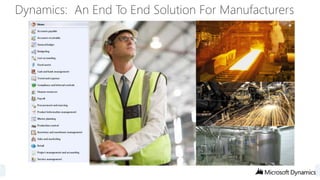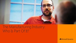 The document provides an overview of manufacturing and Dynamics solutions for manufacturing. It discusses key manufacturing concepts like discrete, process, and lean manufacturing. It also summarizes Dynamics capabilities for various manufacturing processes like product configuration, production planning, inventory management, and quality management. The document aims to demonstrate how Dynamics provides an integrated solution for all essential manufacturing business processes through a single user experience.