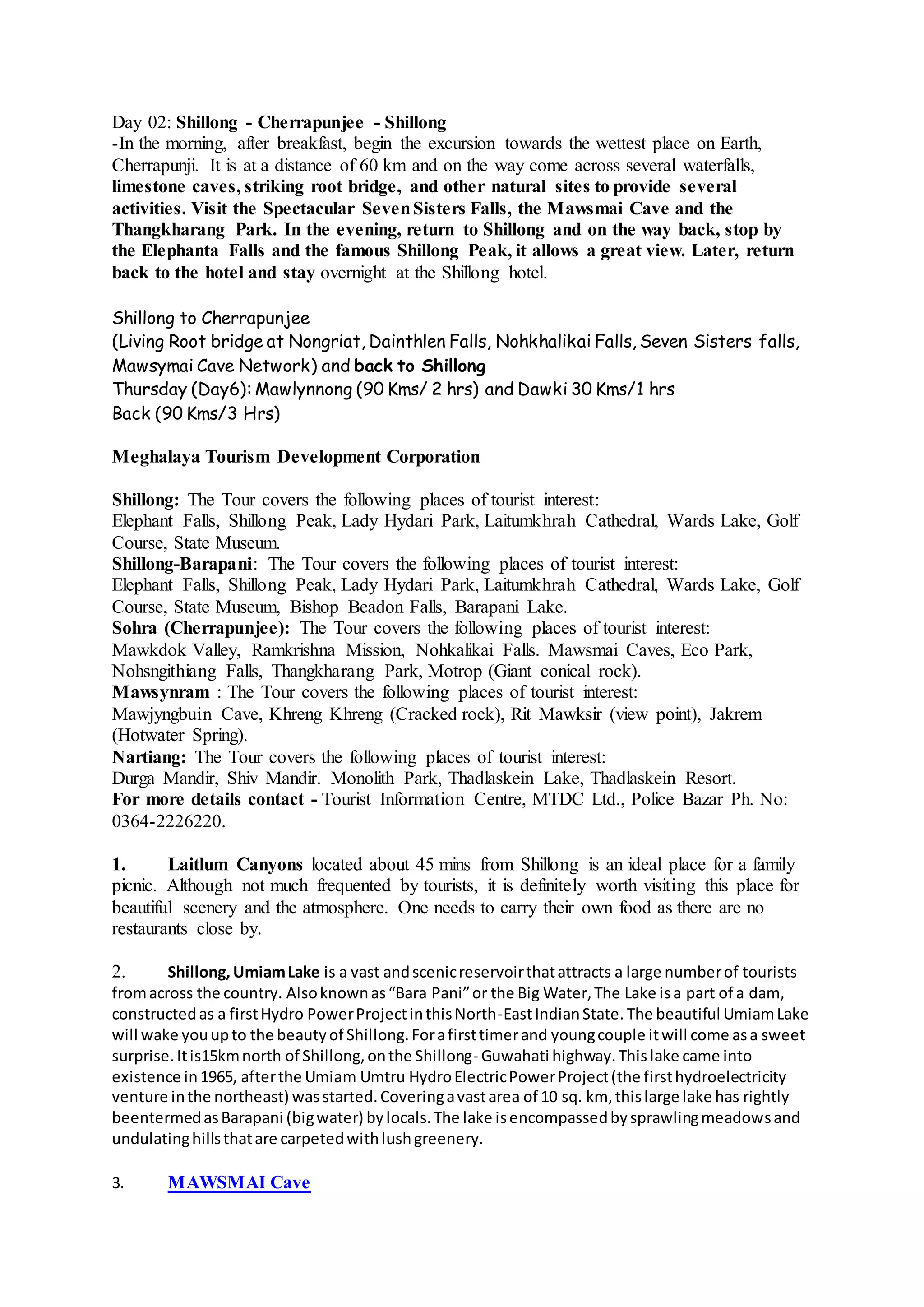 Day 02 of the itinerary involves traveling from Shillong to Cherrapunji, the wettest place on Earth, to visit several natural attractions including the Seven Sisters Falls, Mawsmai Cave, and Thangkharang Park. The tour then returns to Shillong in the evening, stopping at Elephanta Falls and Shillong Peak to take in views of the area. Tourists stay overnight in Shillong.