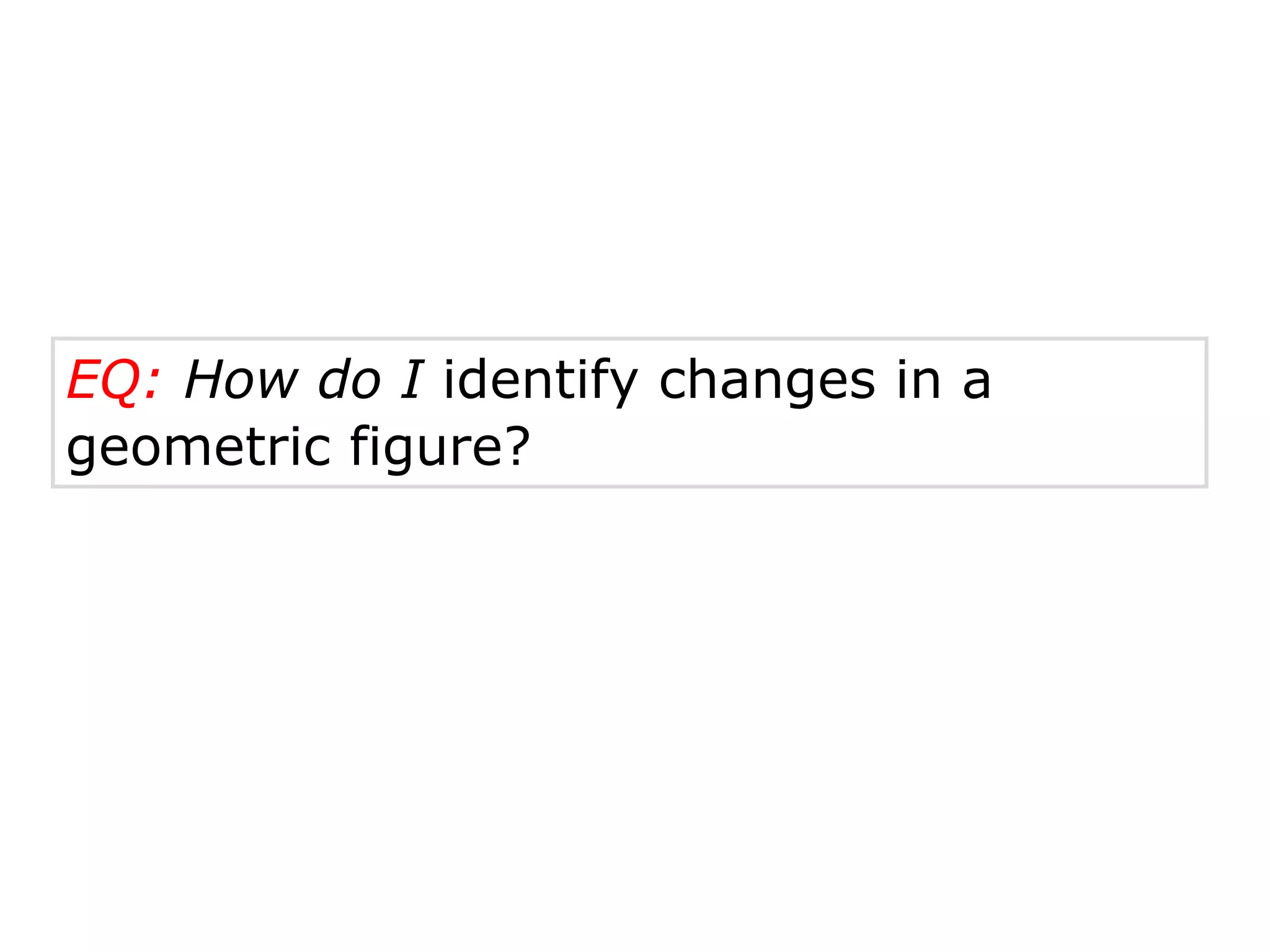 This document discusses identifying changes in geometric figures through transformations. It defines a transformation as changing the position or orientation of a figure, with the resulting figure being the image of the original. There are four main types of transformations: translation, reflection, rotation, and congruence. Translation moves a figure along a straight line without turning. Reflection flips a figure across a line. Rotation turns a figure around a fixed point. The document provides examples of identifying different transformations and their characteristics.