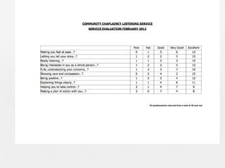 The Community Chaplaincy Listening program at the Dalbeattie Clinic has been running for one year. It provides patients with 6 chaplain appointments per week, serving about 50 patients or 1% of the practice population. Referrals come from doctors and nurses. The benefits include fewer doctor appointments as patients can receive limitless time to talk through issues, less need for specialist referrals or medications as talking helps the healing process, and positive patient perception with over 60% returning to the service. This year developments included a new holistic care room, adding chaplain notes to patient records, and including the service in a local social prescribing pilot. Case studies showed patients who were possibly saved from low mood or depression through open communication with the