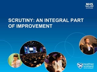 This document outlines Scotland's approach to integrating scrutiny and improvement efforts to enhance care for older people in acute hospitals. It discusses the policy context, a timeline of inspection efforts beginning in 2011, key themes and areas for improvement identified in initial inspections, and an integrated cycle of local self-assessment, inspection, and improvement using evidence-based standards and practices to drive sustainable change. The approach centers patients and aims to address issues like nutrition, hydration, falls prevention, and dementia care through prototype testing of ideas and spreading proven practices.