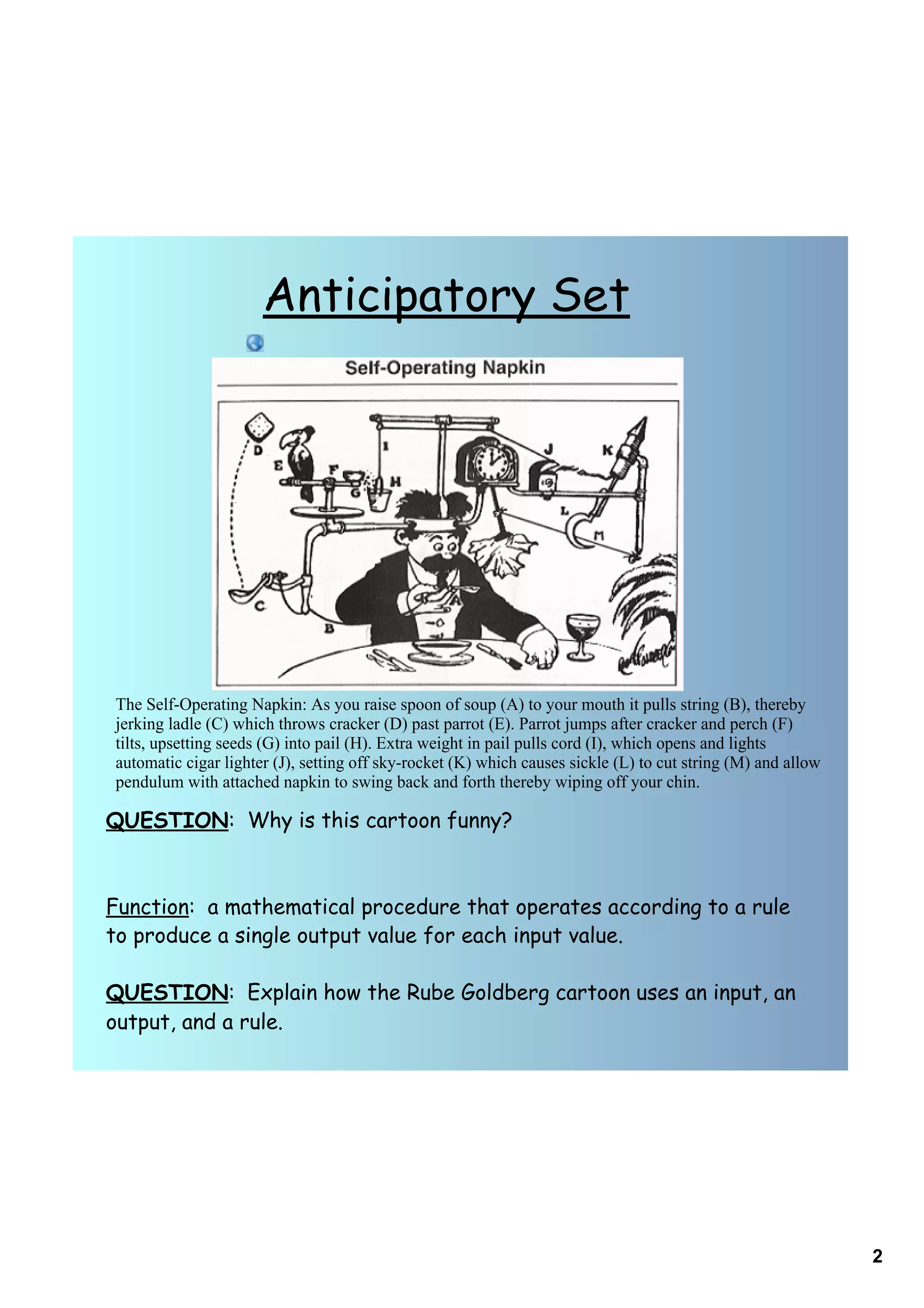 The document discusses using functions to find output values from input values. It provides examples of functions in the form of y=fx(x) and has students complete function tables and plot points for various functions. It discusses how the Rube Goldberg cartoon from the beginning uses an input, output, and rule to demonstrate a function.
