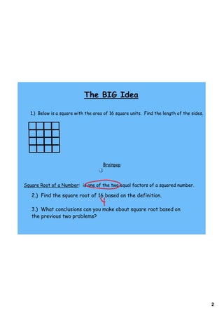 This document provides instruction and practice problems for calculating square roots: 1. It defines a square root as one of the two equal factors of a squared number and introduces the radical sign as the symbol for a square root. 2. Several practice problems are provided to estimate square roots to the nearest whole number and evaluate exact square roots of numbers. 3. An example word problem asks students to approximate the length of each side of a square area of 200 square miles to find a lost hiker.