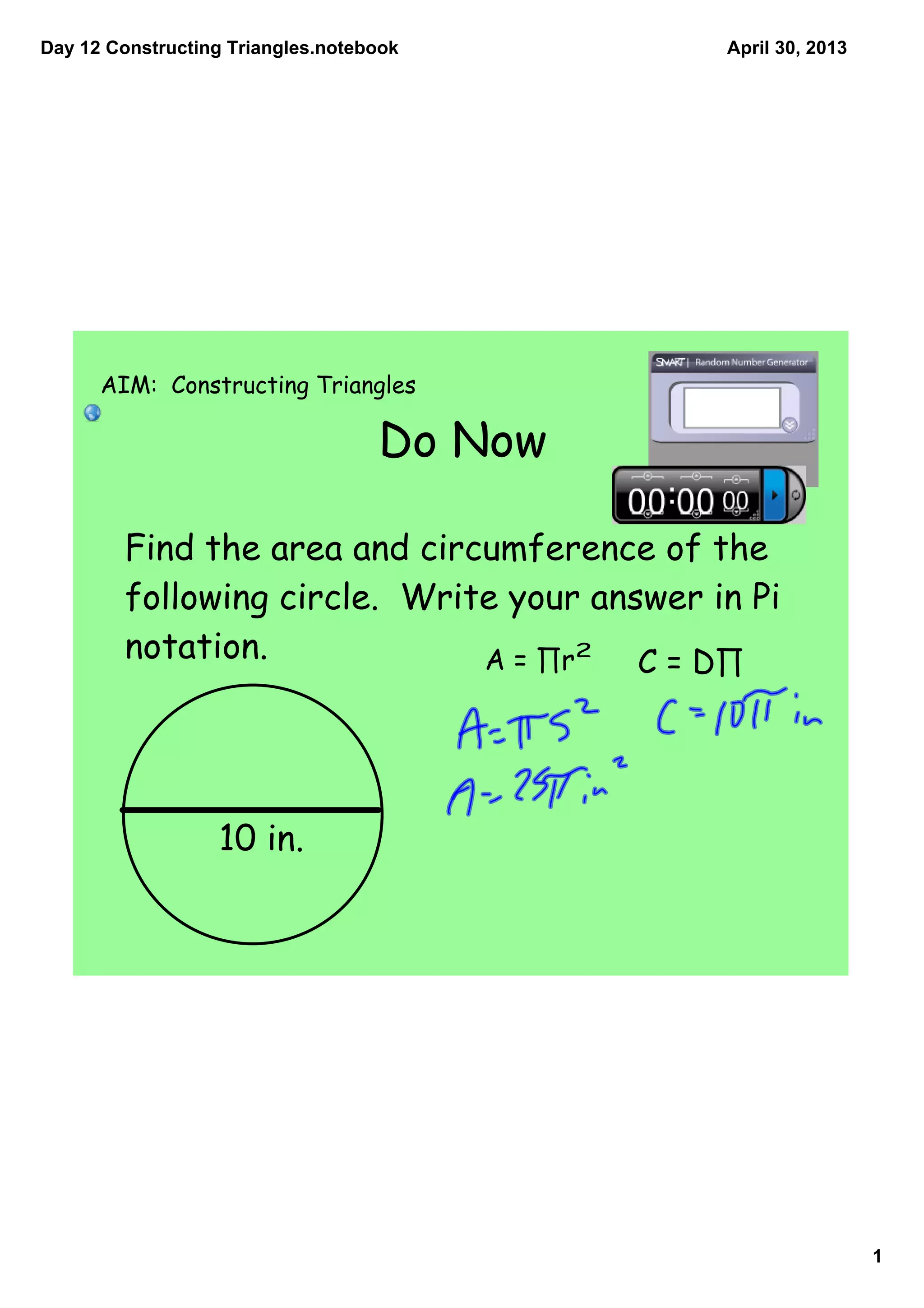 The document provides instructions for constructing triangles given certain angle and side length conditions. It gives examples of constructing Triangle 1 with angles of 300 and 800 and an included side of 2 inches, and Triangle 2 with angles of 550 and 500 and an included side of 1 inch. It then asks students to construct triangles with side lengths of 3, 4, 5 inches and 1, 2, 5 inches and explain whether it was possible. Finally, it provides two practice problems to construct triangles with given angle and included side length conditions before the end of class.
