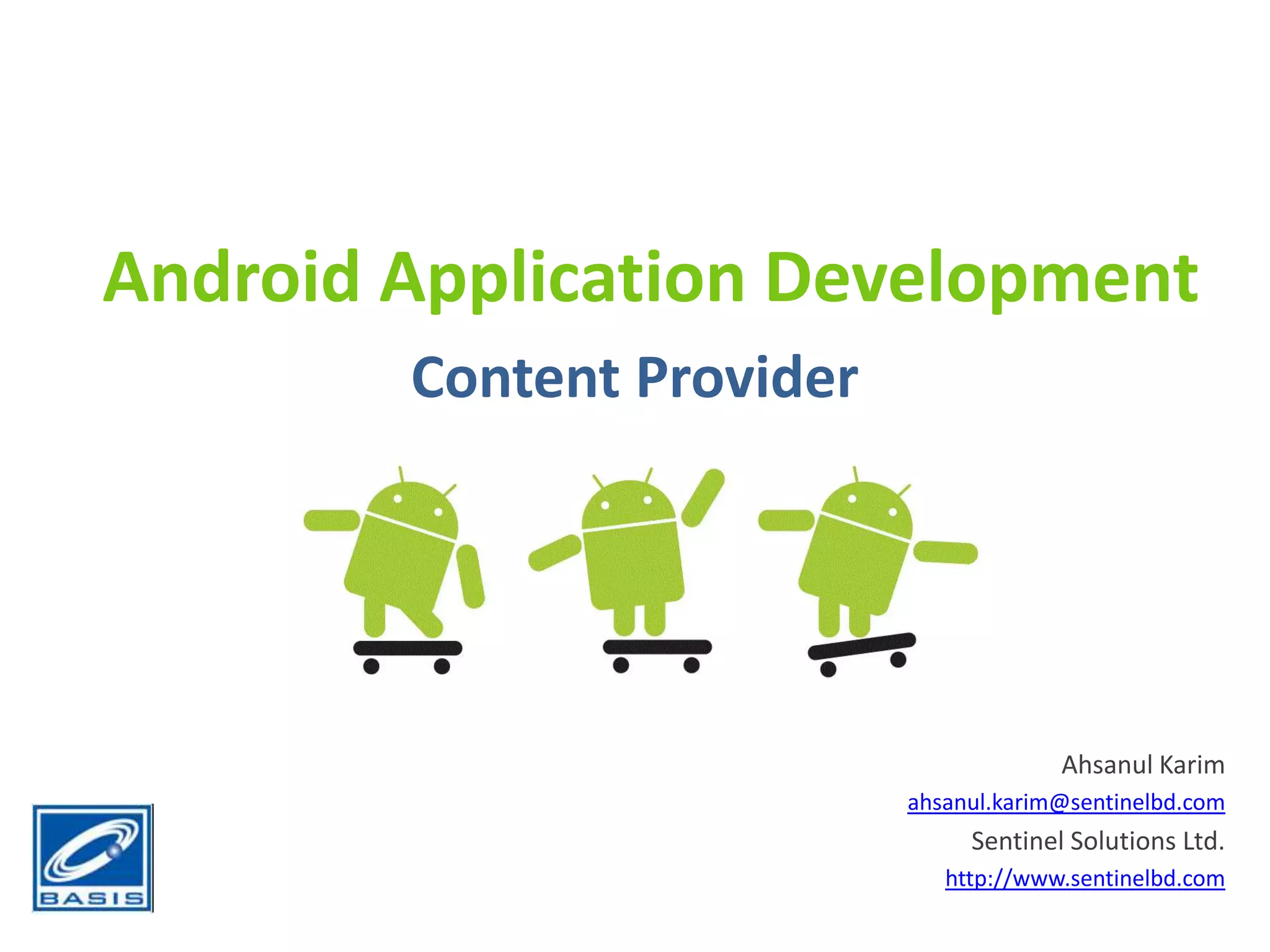 This document discusses content providers in Android application development. It explains that content providers allow applications to share data by making application data available to other apps. A content provider is a class that implements methods to store and retrieve the type of data it handles. It also describes how to query, modify, and add data to content providers. Examples are provided of querying contact data from the device's contacts content provider and updating contact details by modifying the content provider data.