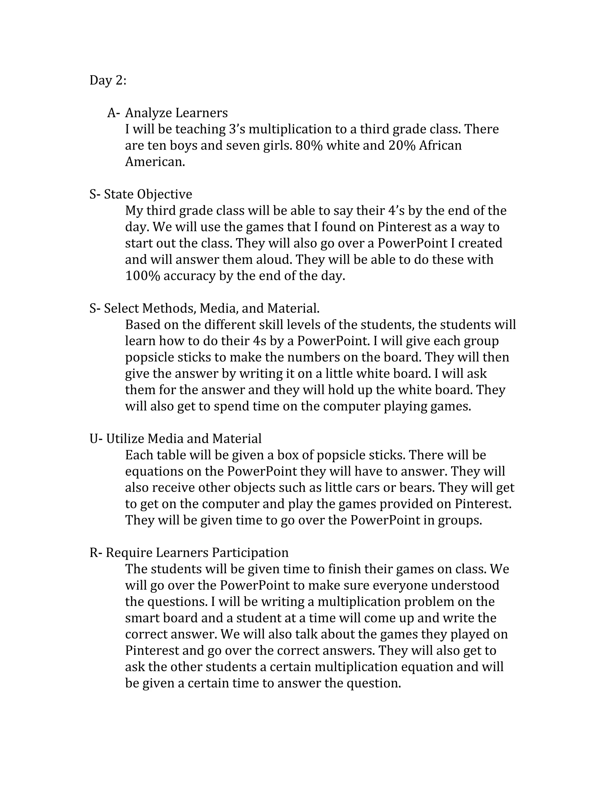 The teacher will be teaching multiplication of 4s to a third grade class of 10 boys and 7 girls, who are mostly white with some African American students. The objective is for students to know their 4s multiplication facts by the end of the day. To help students learn, the teacher will use a PowerPoint presentation and math games found on Pinterest. Students will work in groups using popsicle sticks and other objects to write out multiplication problems and solutions, and they will also get time to play the computer games. Throughout the lesson, students will be required to participate by coming to the board to write problems and solutions, discussing the games, and answering questions posed to each other. Their understanding will be evaluated based on the PowerPoint