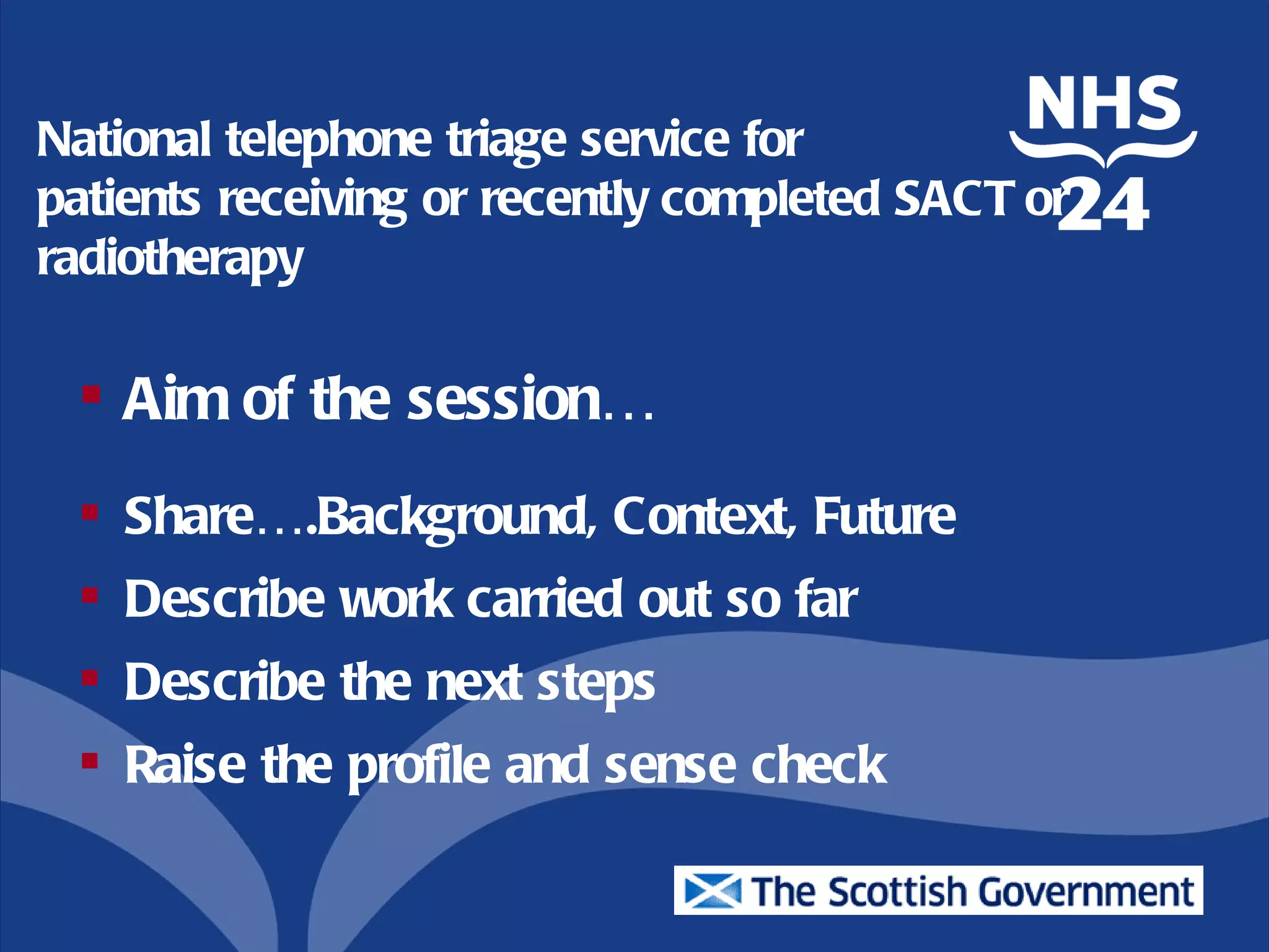 This document discusses implementing a national telephone triage service for cancer patients in Scotland. It aims to provide consistent triage using the UKONS tool and refer patients to secondary care if needed. The service would involve NHS 24 call handlers triaging patients who call a dedicated number with concerns after cancer treatment. Patients referred for further assessment would be seen by an acute oncology team within each region. The benefits cited include safe and reliable triage, timely access to care, and audit capabilities to support quality. Next steps include developing training programs and further planning electronic health integration between NHS 24 and secondary care services.