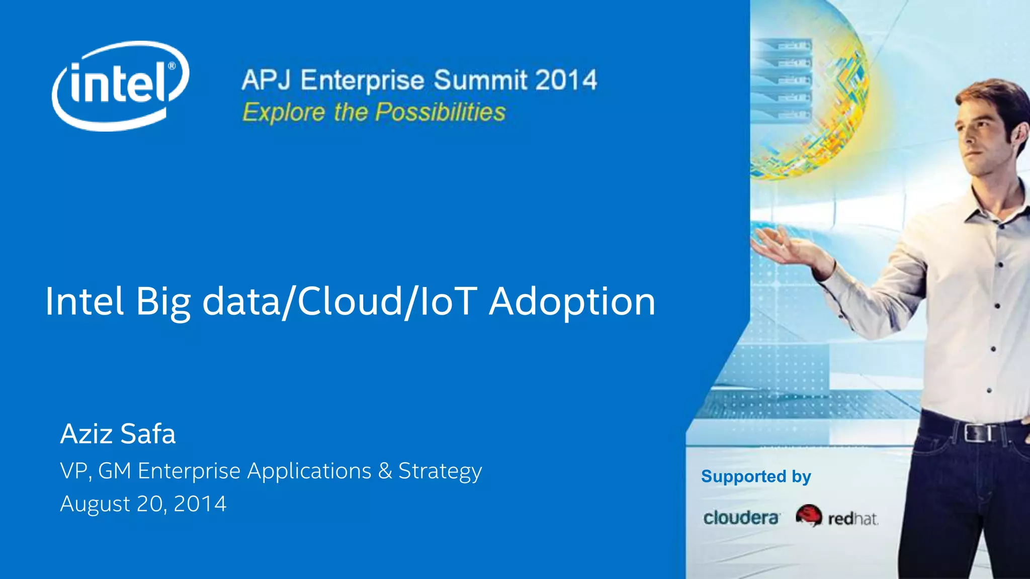 This document summarizes Aziz Safa's presentation on Intel's adoption of big data, cloud, and IoT technologies. It discusses how innovative companies are leveraging big data to create disruptive business models and enhance customer experience. Lower costs of computing and storage as well as the growth of unstructured data are driving big data adoption. However, only a small percentage of available data is currently being analyzed due to legacy techniques being insufficient. Intel proposes a unified big data approach to capture, store, manage, and analyze all data types. Advanced analytics applied to big data can provide a competitive advantage if companies build the right skills and move quickly.