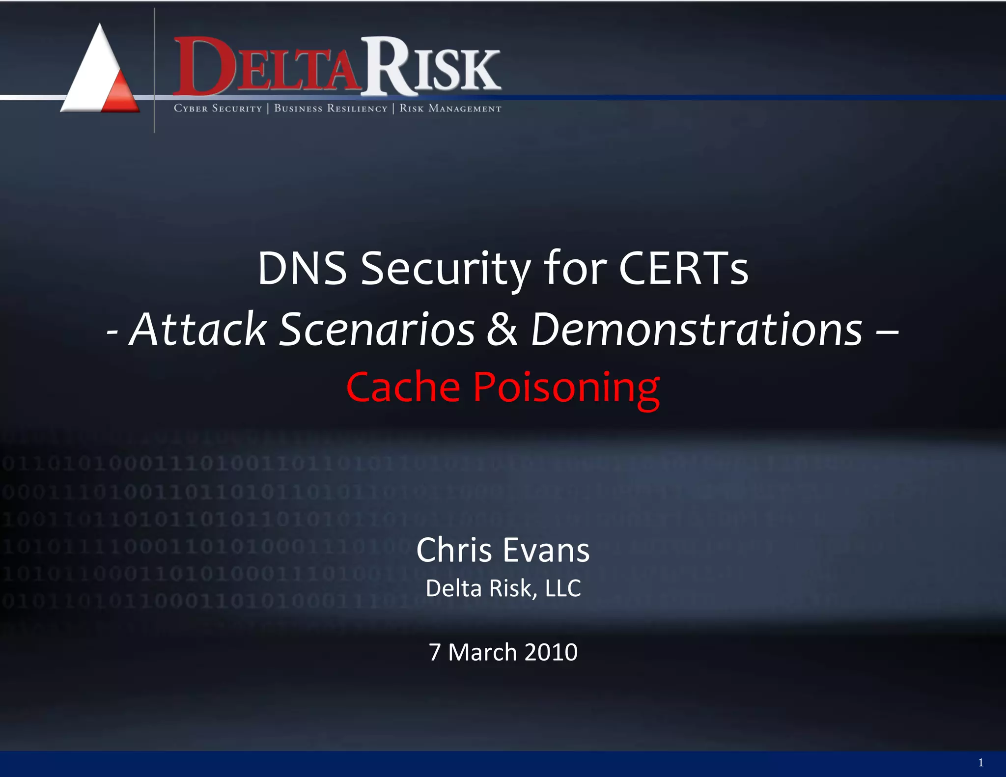 - The document describes a demonstration of a DNS cache poisoning attack. It provides instructions for setting up the attack using tools on a Ubuntu VM. The attack spoofs DNS responses to redirect traffic from a domain to a malicious IP address controlled by the attacker. This could enable realistic phishing attacks. Mitigation strategies include DNSSEC, SSL, and monitoring recursive DNS servers, but user awareness remains important.