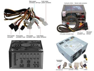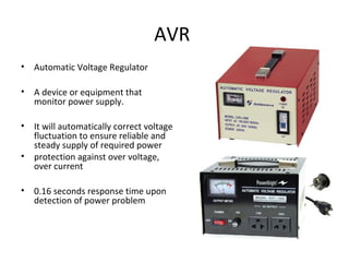 The document provides information about various components related to computer power and protection. It discusses automatic voltage regulators that monitor and regulate power supply, and uninterruptible power supplies that provide backup power during outages. It also covers symptoms of power problems, steps for power protection, power supply components and diagrams, and types of power connectors and supplies. Power needs are discussed in relation to system components.