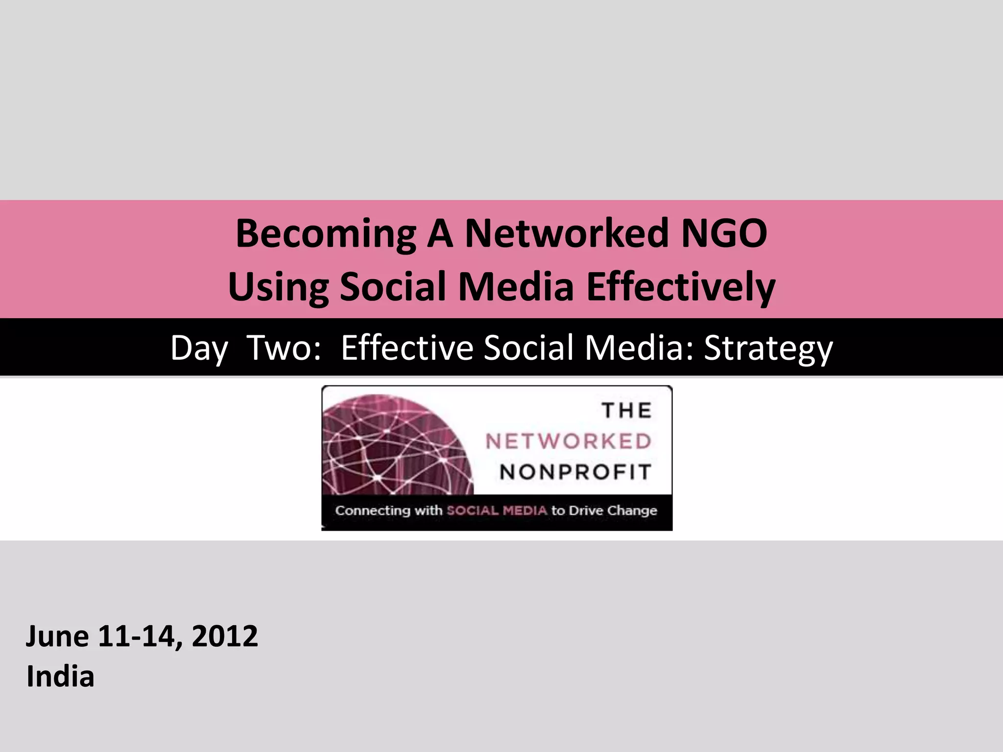 The document outlines strategies for effective social media use by NGOs. Day 2 of the workshop focuses on developing an integrated social media strategy. The agenda includes introducing principles of effective social media, inspiring success stories from other NGOs, and creating a strategic presence and content strategy. Key principles discussed are aligning social media with communications objectives and audiences, monitoring networks to understand people and conversations, and integrating social media as part of an overall communications strategy across multiple channels. Success is defined as increasing membership, garnering attention, passing policies, and collaborating with partners.
