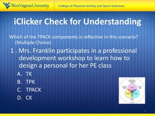 This document discusses integrating instructional technology into physical education and sport. It provides examples of scenarios involving different teachers using technology and asks which component of the TPACK framework each scenario reflects. It then outlines topics to be covered, including action research in physical education, developing teacher skills and comfort with technology, and using tools for lesson planning and delivery like Prezi and web-based resources.