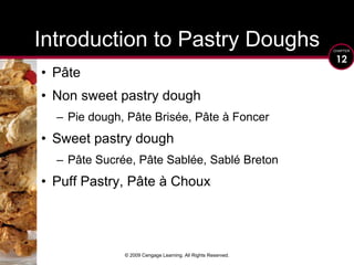 This document discusses different types of pastry doughs used in baking, including unsweetened doughs like pie dough and pâte brisée as well as sweetened doughs like pâte sucrée, pâte sablée, and pâte à sablé breton. It describes the key ingredients in each type of dough like flour, fats, liquids, sugars, and leavening agents. The functions of these ingredients are explained. Methods for mixing different doughs are also outlined. The document provides information on producing and working with various pastry doughs.