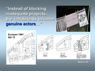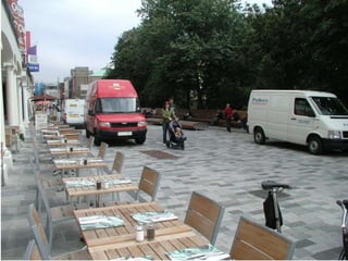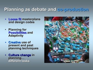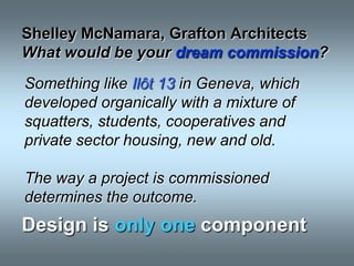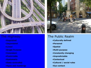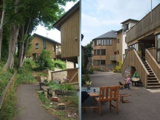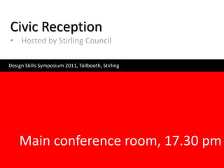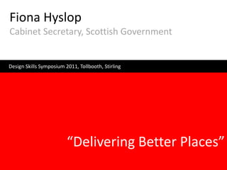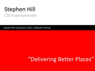The document summarizes presentations from Day 2 of the Design Skills Symposium 2011 in Stirling, Scotland. It discusses topics like delivering better public spaces, street design examples from various cities, redesigning streets to be more people-focused rather than car-focused, examples of successful community-led housing and co-housing projects in the UK and abroad, and debates around design control and co-production of neighborhoods.