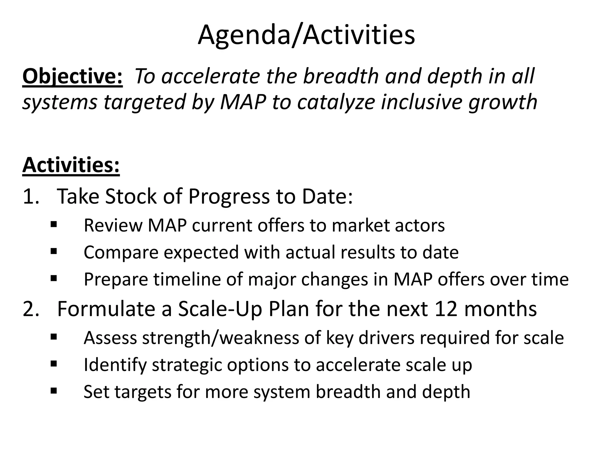 1) Take stock of progress to date by reviewing MAP offers and comparing expected vs. actual results to formulate a scale-up plan.
