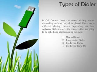 The document discusses different types of dialing modes used in call centers, including manual, progressive, predictive, and predictive hang-up dialers. It also covers call center concepts and technologies like automatic call distribution, computer telephony integration, interactive voice response, voice over internet protocol, average handle time, and key performance indicators. The various dialing modes and technologies are used to efficiently route calls and customer information to agents.