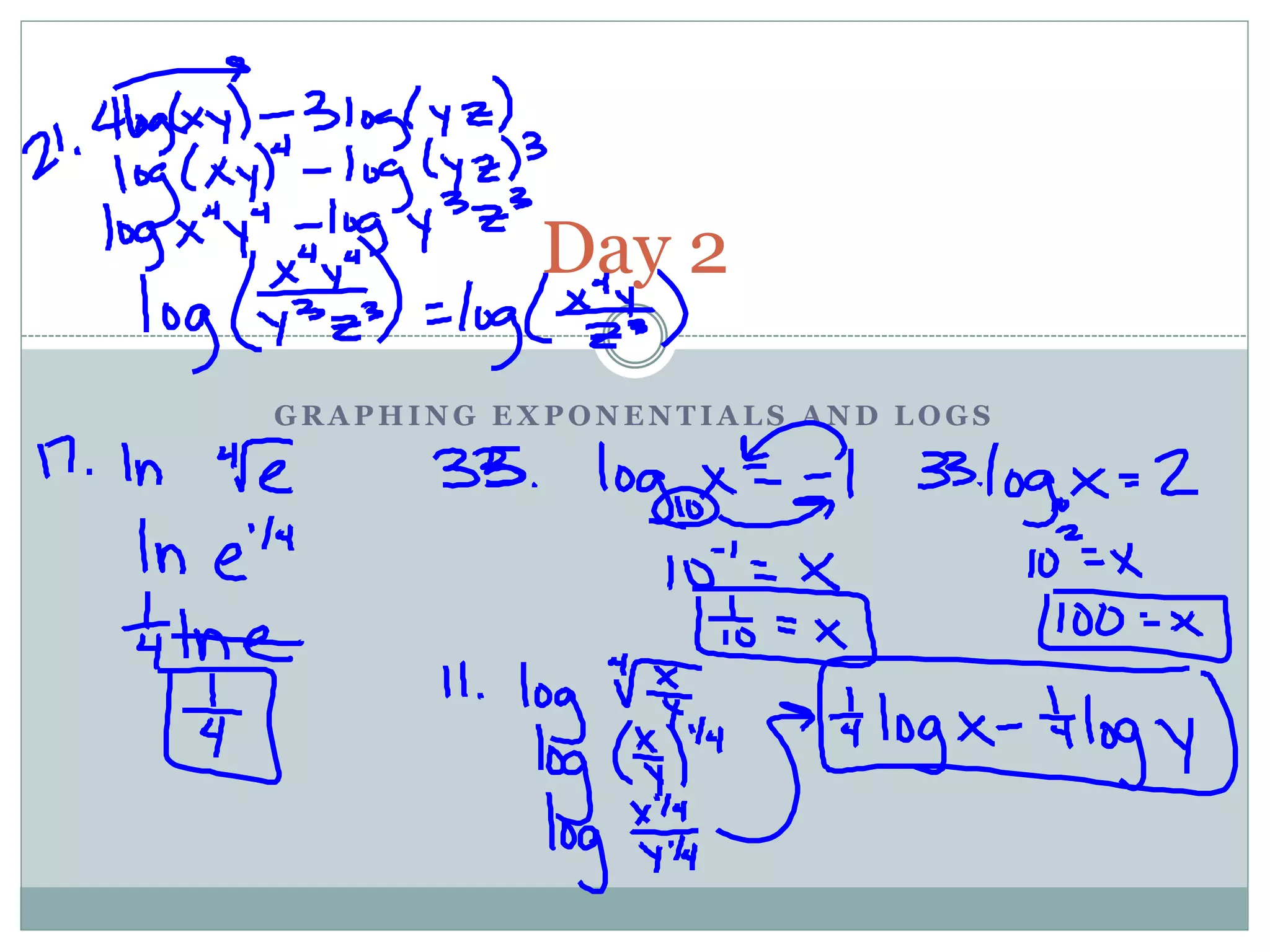 This document provides information about exponential functions and graphs. It defines the general form of an exponential function as y = abx, where a ≠ 0, b > 0, and b ≠ 1. It discusses exponential growth and decay models and provides examples of writing functions to model population growth and depreciation. It also covers graphing exponential functions, including determining horizontal asymptotes, domain and range. It concludes with examples of translating exponential functions by adding or subtracting terms.