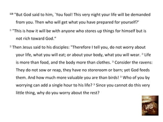 Jesus tells a parable about a rich man who had a bountiful harvest but was greedy. The man tore down his barns to build bigger ones to store his excess goods, believing he had plenty for many years. But God said to the man "You fool! This very night your life will be demanded from you." Jesus warns his disciples not to worry about worldly possessions or goods, but to seek God's kingdom instead.