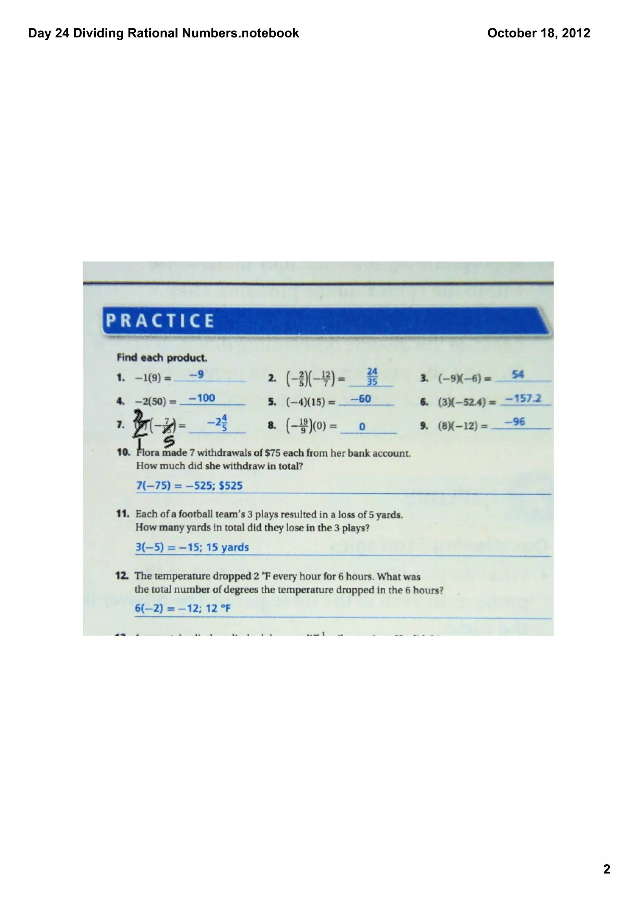 This document covers a lesson on dividing rational numbers. It includes examples of dividing rational numbers with steps shown. There are also practice problems for students to complete involving dividing rational numbers. The document aims to teach students how to divide rational numbers and provide practice through examples and problems.