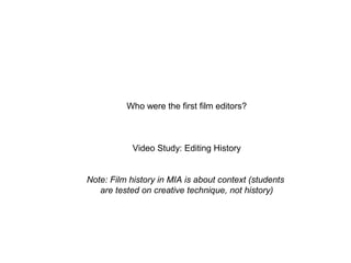 1) A brief history of film editing from early experimentation to its establishment as a creative partnership between editors and directors.