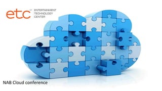 The document discusses a conference organized by ETC's "Project Cloud" which aims to bring together technology and film industry leaders to explore how cloud-based resources can accelerate and evolve film and media creation. It defines cloud computing as a model for on-demand access to configurable shared computing resources via networks that can be rapidly provisioned with minimal management. The definition notes cloud computing is composed of essential characteristics, service models, and deployment models.