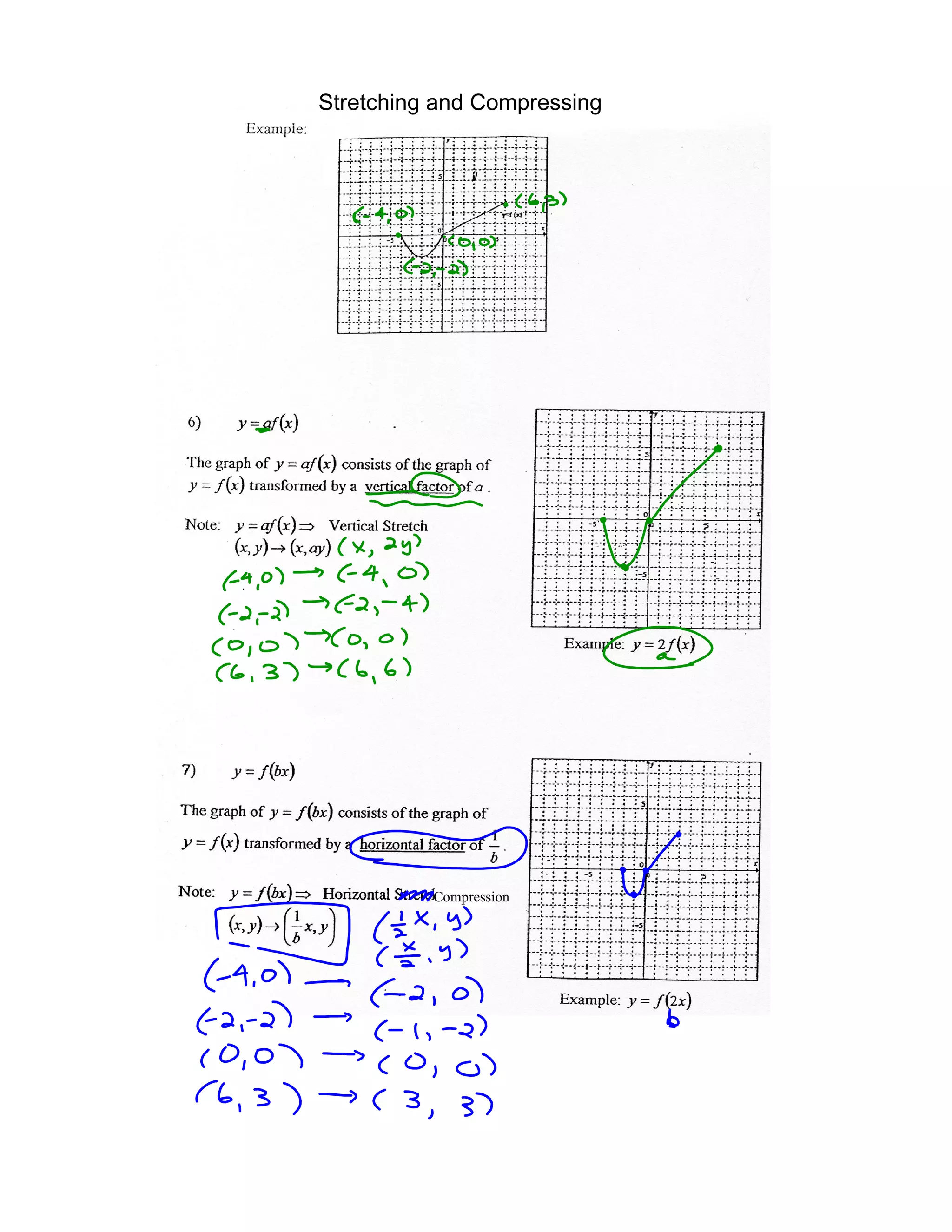 This document discusses stretching and compressing functions both horizontally and vertically. It provides examples of compressing functions vertically by factors like 1/3 and horizontally by factors like 1/2 or -2 which compresses the graph left or right respectively. Functions can be stretched or compressed by applying factors to the input or output values.
