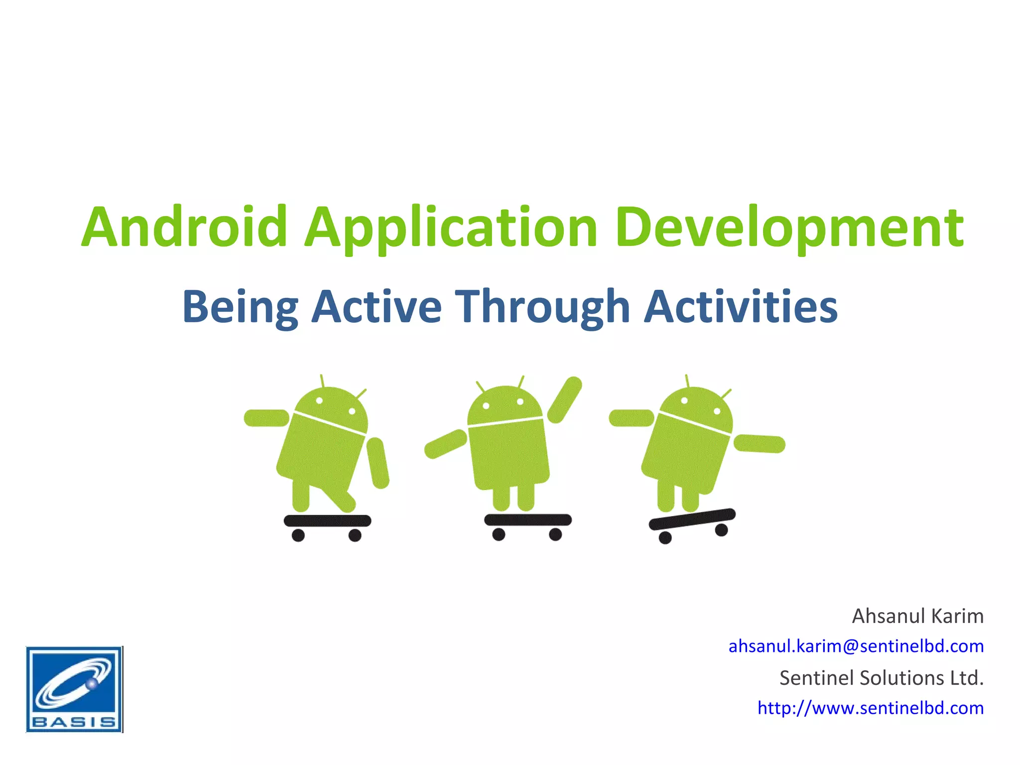 The document discusses Android application development and activities. It covers the anatomy of an Android application including activities, services, content providers, and broadcast receivers. It also discusses the lifecycle of activities and how to create activities that load layouts and handle user interactions through callbacks like onCreate(). An example is provided of building an app with an activity to display the current time when a button is pressed to demonstrate designing user interfaces and adding interactivity.