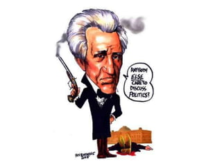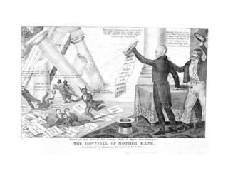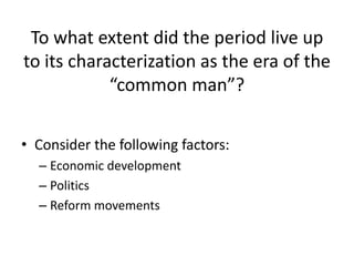 Andrew Jackson's presidency from 1824-1848 ushered in an era of the "common man" in America. Jackson grew up poor and outside the original 13 colonies, which appealed to more Americans. As president, he opposed the Bank of the United States, siding with western farmers over eastern bankers. Jackson also instituted the spoils system, rewarding political supporters with government jobs instead of prioritizing experience, bringing possibility of office closer to common people. Overall, Jackson's background and policies aligned him with regular Americans over the wealthy and privileged.