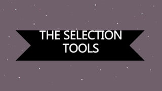 The document discusses the selection tools in Adobe Photoshop CS6. It describes several tools for making selections including the marquee, lasso, quick selection tool, and magic wand. It explains how to move, crop, transform and modify selections. Common selection techniques are covered such as selecting all or inverting a selection.