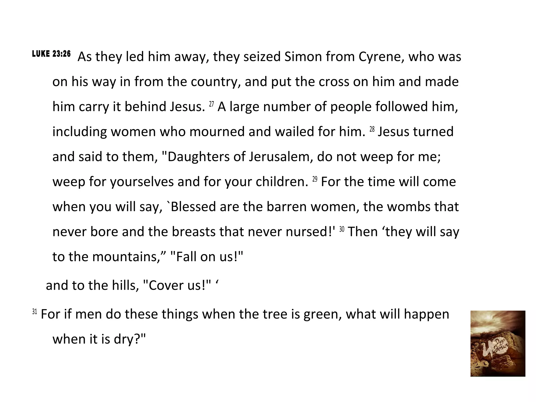 Simon of Cyrene was forced to carry Jesus' cross to the crucifixion site. Many people, including women, followed and mourned for Jesus. At the crucifixion site, Jesus was crucified between two criminals. One criminal insulted Jesus while the other rebuked him and asked Jesus to remember him in paradise, to which Jesus replied that today they would be together in paradise. There was darkness over the land from noon until 3pm, and when Jesus died the temple curtain was torn in two.
