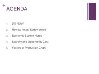This document provides an agenda and learning objectives for an economics lesson. It includes a DO NOW asking students to define scarcity and discuss its importance. The agenda has 5 items: 1) DO NOW, 2) Review notes and an article, 3) Take notes on economic systems, 4) Learn about scarcity and opportunity cost, 5) Complete a factors of production chart. It lists 3 learning objectives: 1) Identify factors of production, 2) Explain scarcity's role in trade-offs and opportunity cost, 3) Give examples of opportunity cost from their own lives.