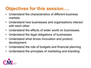 This document provides an overview of business principles including marketing, sales, financial management, and innovation. It discusses key topics such as defining business markets, organizational goals and factors that influence innovation, different business structures, marketing mix and techniques, importance of financial planning and budgets, and principles of market research. The objectives are to help understand customer interactions, external influences on business, legal obligations, and what drives new product development and marketing strategies. Various models of innovation and factors affecting organizational goals are presented.