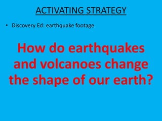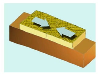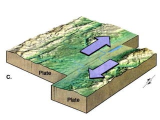 The document provides information about tectonic plate boundaries including definitions of convergent, divergent, transform, and subduction boundaries. It describes how each boundary type results from the movement of tectonic plates and the effects this has in changing the Earth's surface through processes like mountain building, volcanism, and earthquakes. Students are tasked with learning about the different boundary types, their identifying features, and how they impact the planet.
