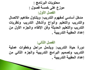 تتناول الحقيبة التدريبية إعداد برنامج متكامل لمحترفي التدريب من خلال خمسة فصول تتضمن مفاهيم التدريب، دورة حياة التدريب، ومعينات التدريب، وأساليب تدريبيه وتخطيطها، ووسائل تقييم العائد من التدريب. تسلط الحقيبة الضوء على أهمية تصميم البرامج التدريبية الفعالة وتقويم أثر التدريب على الأداء الفردي والمؤسسي. كما تتضمن أساليب تنظيم الجلوس والتفاعل بين المشاركين لتحقيق أقصى فائدة من التدريب.