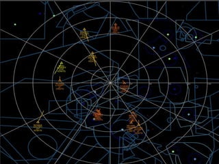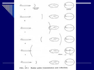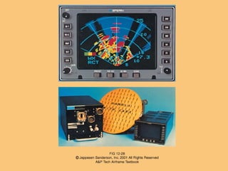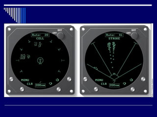 This document discusses several types of radar systems used in aviation. It describes how ATC radar works using UHF to monitor aircraft positions and allow air traffic controllers to direct pilots. It also explains weather radar systems that allow pilots to detect storms and avoid hazardous conditions. Different radar frequencies like C-band and X-band are discussed as well as other systems like radar altimeters, GPWS, and Stormscope that provide additional safety functions.