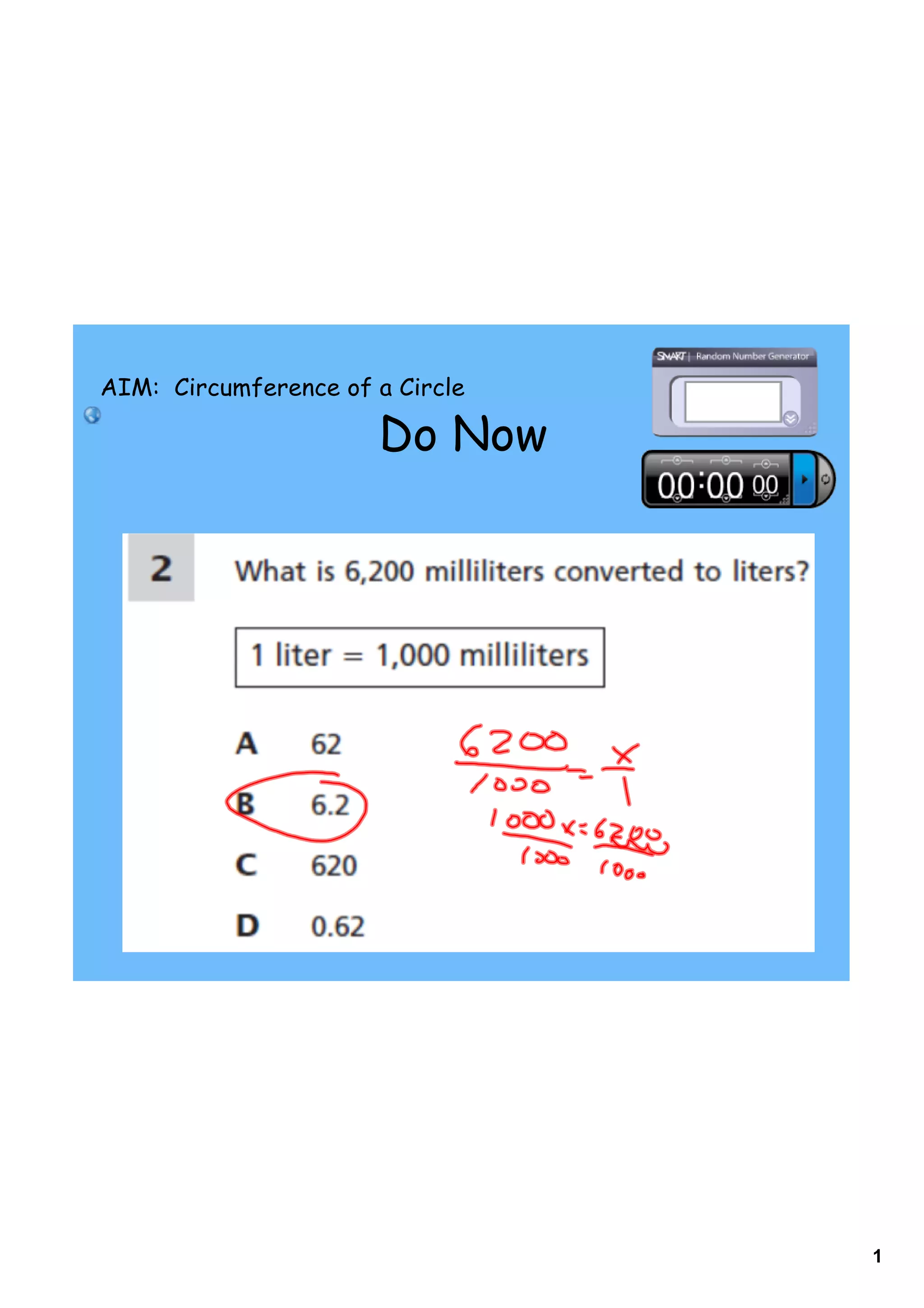 This document provides instruction on calculating the circumference of a circle. It includes the formulas for circumference (C = πd and C = 2πr) and examples of using the formulas to find the circumference given the diameter or radius. It also includes examples of finding the radius or diameter given the circumference. The document is intended to teach students how to relate radius, diameter, and circumference and use formulas to solve for any one of those values if two values are known.