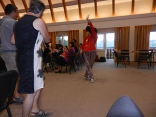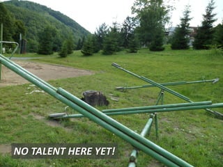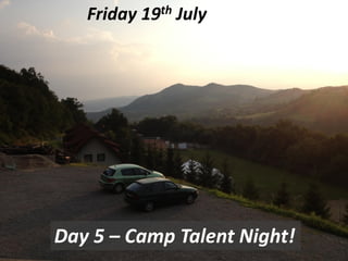 Day 5 of camp involved preparations for a Talent Night, with notes about checking on results and having fun and games with children. A group photo was taken at English Camp before lunch. The day concluded with the Talent Night featuring clowns and folk dancing, with some participants questioning or commenting on the performances and activities throughout the day.