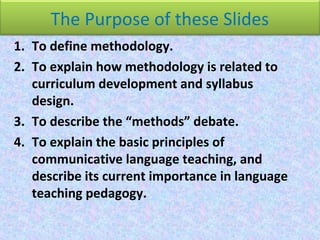 The document discusses language teaching methodology. It defines methodology as the study of practices, procedures, and principles of language teaching. Methodology involves syllabus design, teaching techniques, and evaluation. The document outlines different language teaching methods throughout history, including grammar translation, audiolingualism, cognitive code learning, humanistic approaches, and communicative language teaching. It emphasizes that the goal of methodology is no longer to find a single "right method" but rather focus on how to effectively teach based on principles and learner needs.