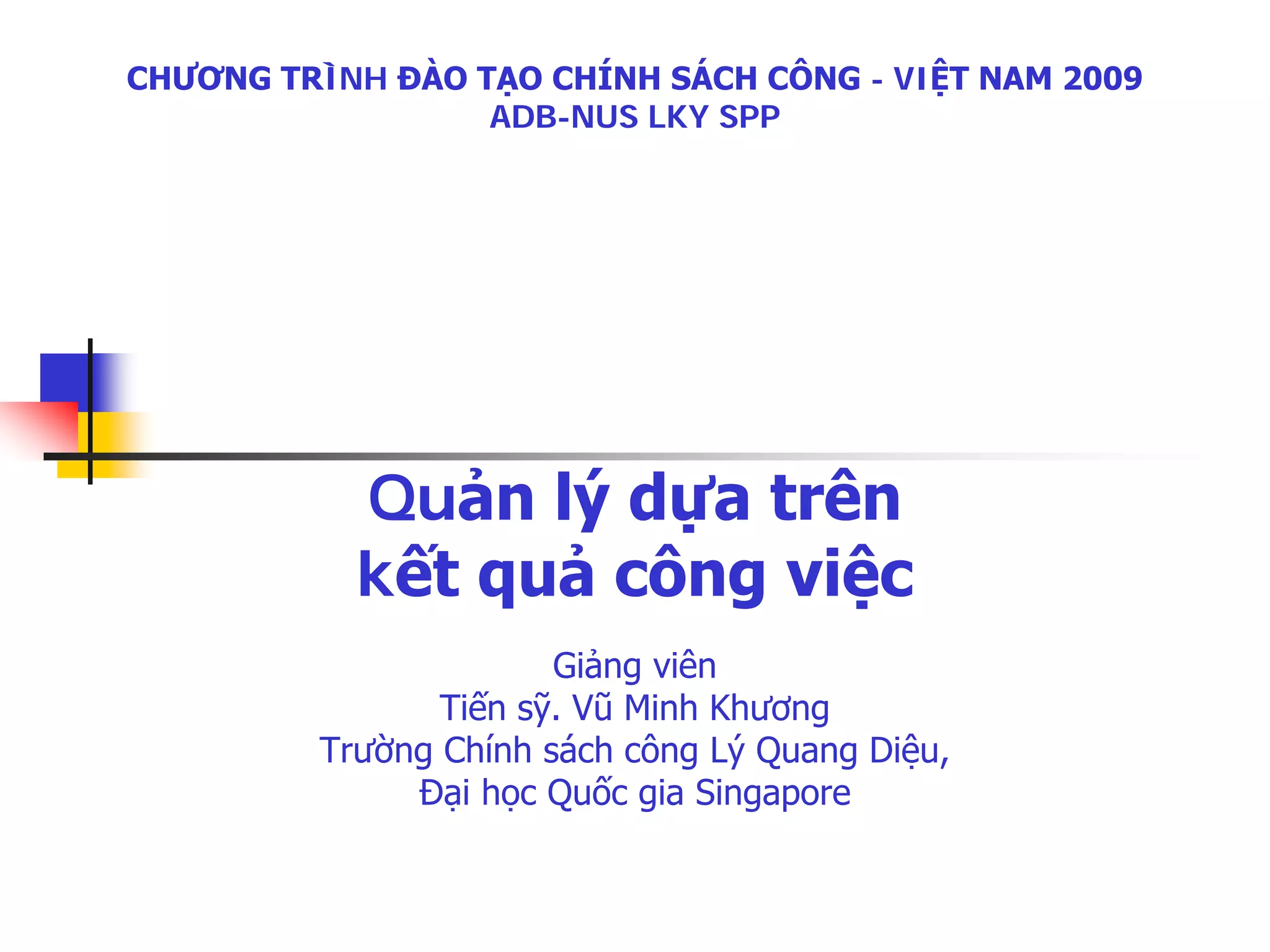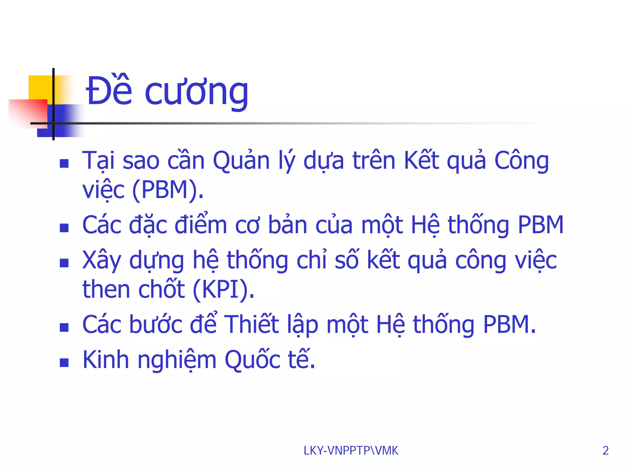 Tài liệu trình bày về chương trình quản lý dựa trên kết quả công việc (PBM) tại Việt Nam, nhằm cải thiện hiệu suất thông qua việc thiết lập các chỉ số kết quả công việc (KPI) và đánh giá chiến lược. Các đặc điểm của một chương trình PBM hiệu quả bao gồm tính chiến lược, hệ thống, minh bạch và khả năng cải tiến liên tục. Một chương trình PBM tốt giúp xác định và theo dõi mục tiêu, đánh giá thành tích, và duy trì sự công bằng trong tổ chức.