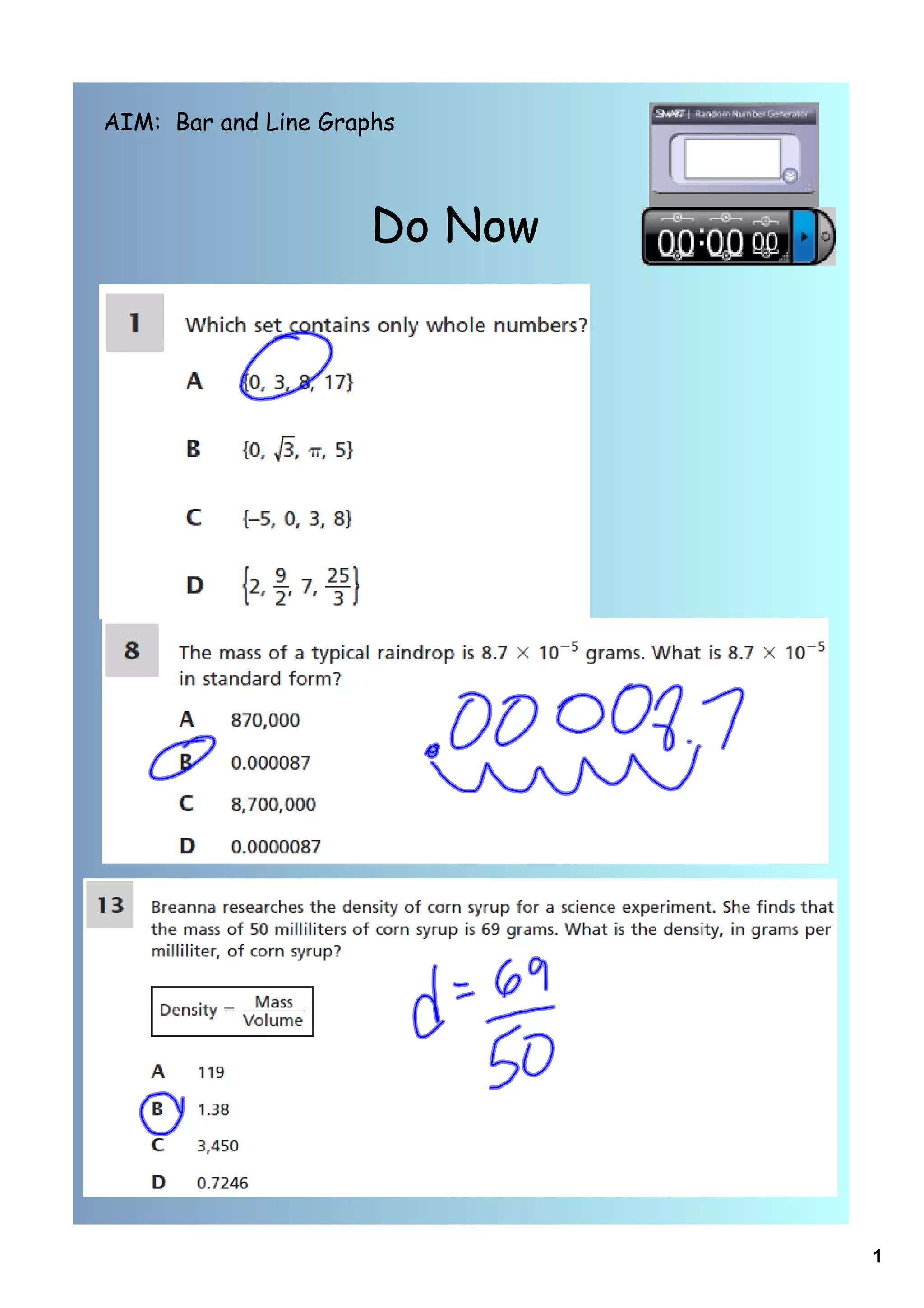 The document provides instructions for students on how to construct and interpret bar and line graphs. It includes examples of frequency tables used to organize data into categories for a bar graph showing average high temperatures in 20 cities on a February day. It also has sample line graphs showing home sales over a year and questions students should answer based on the data in the graph. Finally, it poses multiple choice questions testing students' abilities to interpret data from bar and line graphs.