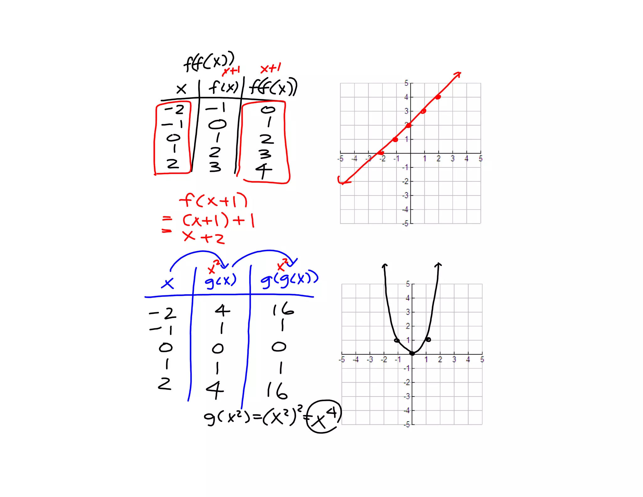 This document provides examples of graphing composite functions. It explains that to find the domain of a composite function f(g(x)), you must consider the restrictions on the domains of both the inner and outer functions. It then gives three examples of determining the composite functions f(g(x)) and g(f(x)) for various functions f and g, and calculating or graphing their domains and ranges. The final example asks to determine possible functions f and g that satisfy three given composite functions.