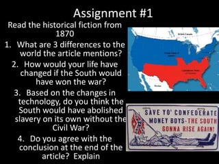 This document contains assignments and materials for lessons on the US Civil War and Reconstruction era. It includes discussion questions, pre-tests, group assignments, and individual projects. Some of the key topics covered are Sherman's March to the Sea, the end of the war at Appomattox, the Reconstruction Amendments, and debates around Confederate imagery and monuments in the South. Students are asked to analyze primary and secondary sources, consider different historical perspectives, and communicate their understanding in various written and visual formats.