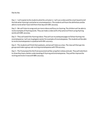 The unit plan spans 5 days and teaches students about rhyming and onomatopoeia. On day 1, students learn definitions using videos and must recite terms with 50% accuracy. Day 2 focuses on rhyming words through songs and videos, with students giving examples at 60% accuracy. Day 3 has students identify onomatopoeias from a webquest and poster, then recite them in a podcast at 45% accuracy. On day 4, students finish podcasts and make a group video reciting terms at 75% accuracy. Finally, on day 5 students re-do their videos and a final assessment to show improved understanding, reciting with 80% accuracy.