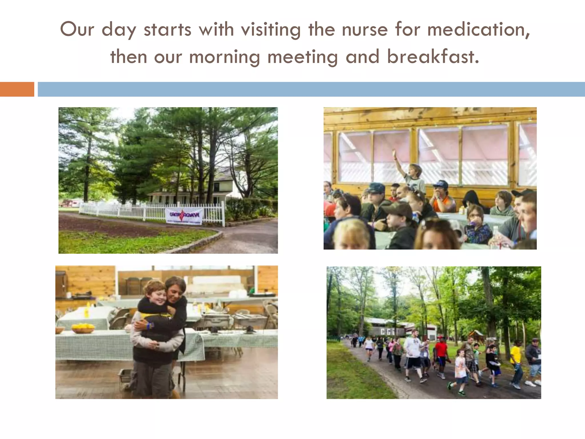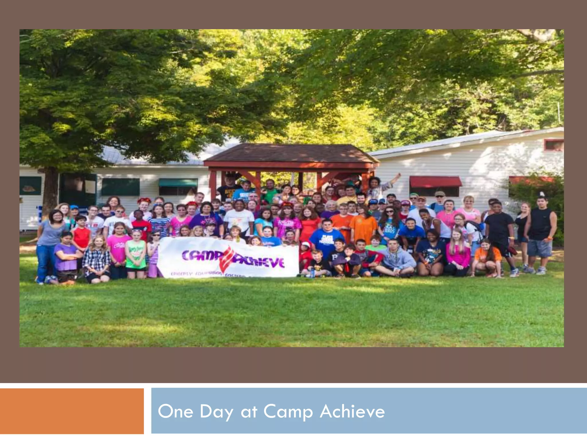 Campers at Camp Achieve start each day with medication and a morning meeting before choosing from activities like basketball, climbing walls, crafts, archery, soccer, volleyball, or swimming. Evenings include a camp dance or talent show followed by rest in the cabins after a fun-filled day.