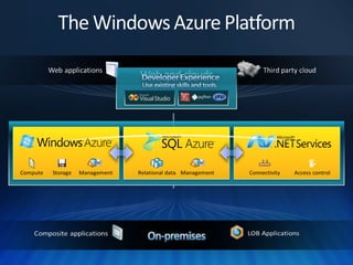 The document highlights Windows Azure as a scalable cloud computing platform designed for running applications with automated management via a fabric controller. It covers key features like SQL Azure as a relational database service, its multi-tenant architecture, and integration with on-premises applications utilizing .NET services and service bus capabilities. Additionally, it provides insights into the purchasing models, service level agreements, and pricing for different Azure components.